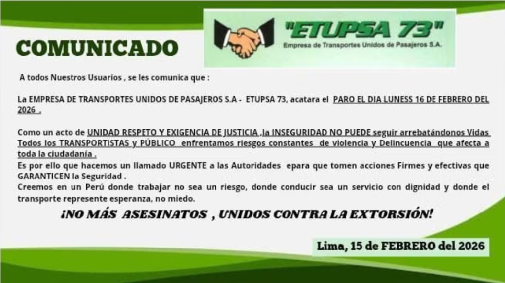 La medida de fuerza, liderada por el grupo ‘El Rápido’, cuenta con el respaldo de compañías como Etupsa 73, ‘La 50’, Huáscar y Salamanca Parral, cuyos gremios exigen garantías mínimas de seguridad ante la ola de extorsiones que afecta al 80% de las empresas del sector.