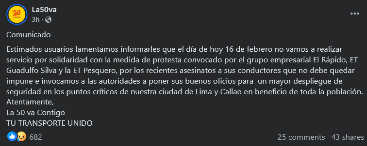 Diversas empresas de transporte público en Lima y Callao han suspendido sus operaciones este lunes 16 de febrero en protesta por el asesinato de un conductor de la línea JC Bus.
